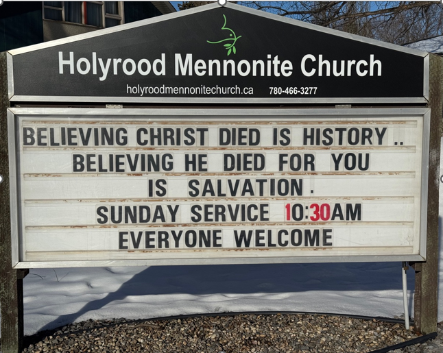 We acknowledge with gratitude and humility that Edmonton Holyrood Mennonite Church is located on Treaty Six territory,
